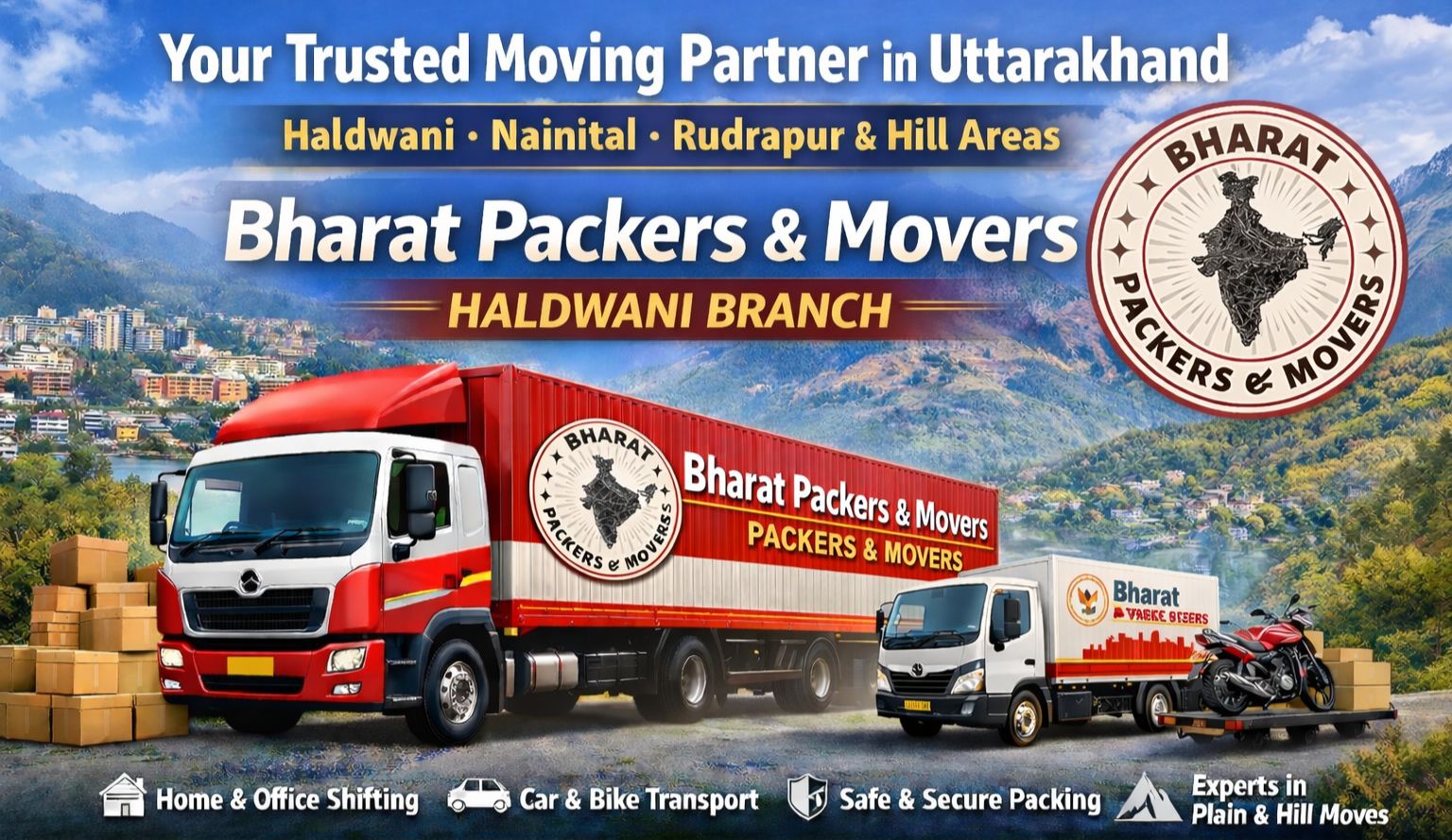 Looking for trusted Packers and Movers in Haldwani and across Uttarakhand? Bharat Packers and Movers – Haldwani Branch offers end-to-end relocation services for homes, offices, and vehicles with a strong focus on safety, affordability, and timely delivery.